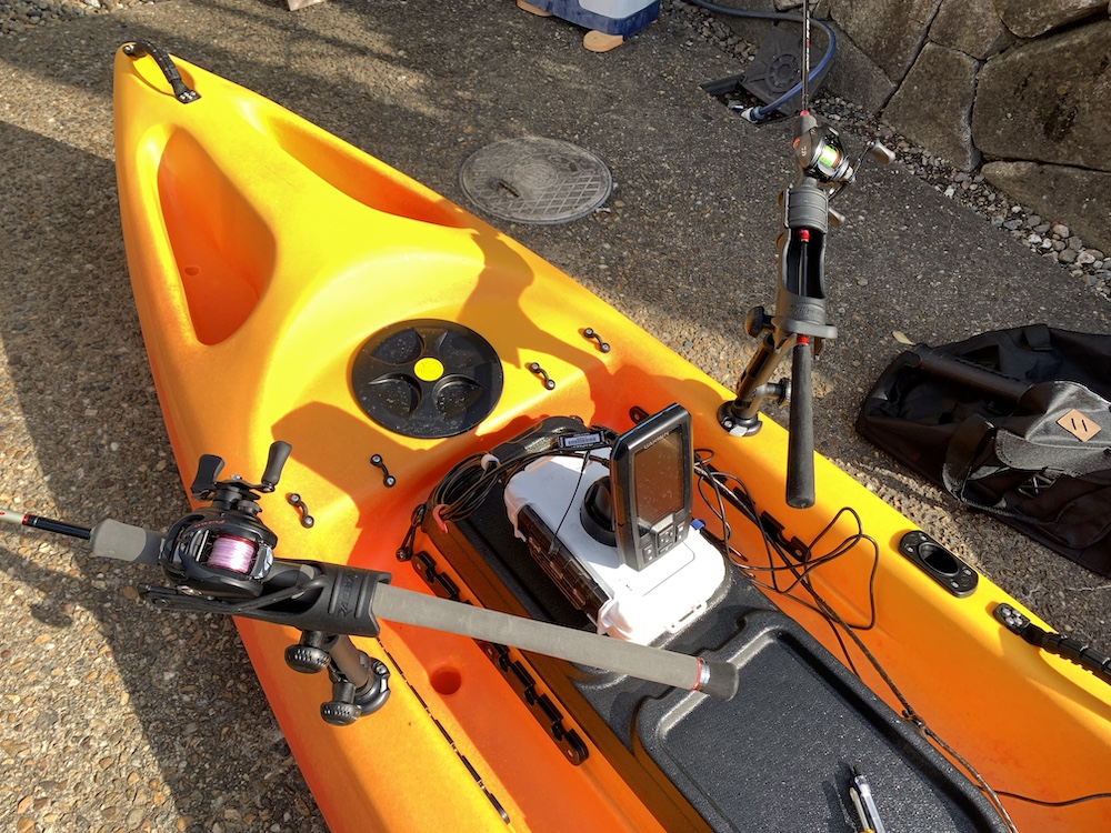 今回は、フロントバーにロッドホルダーを2ヶ所設置して釣りをしてみたが、パドリングには干渉しないものの、中央に取り付けた魚探にロッドのグリップエンドが被ってしまって、なんともモニターがみづらい…そもそもの前提として、トローリングにはタイラバロッドを代用しているのだけど、これにも大きな問題があると感じている(トローリングロッドについては、別の記事で書きたいと思う)。