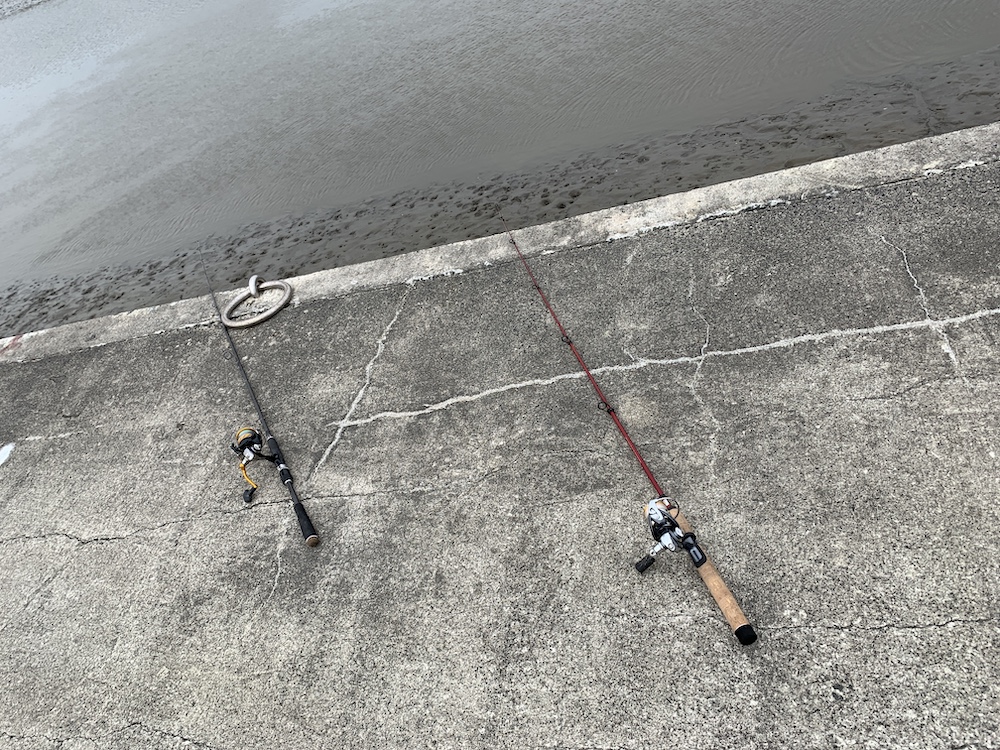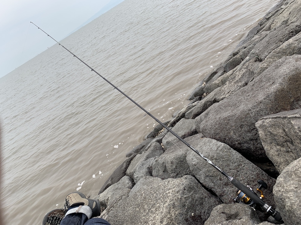 護岸が入ってるところに降りることができたので、岩と岩の隙間にロッドを突き刺して竿立てがわりに。