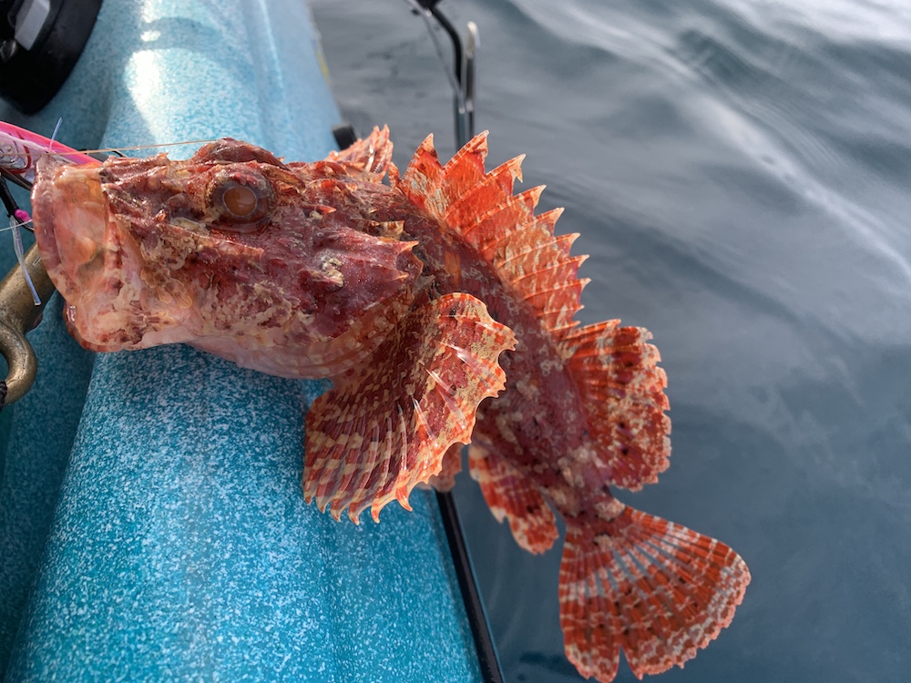 背鰭の棘条が12棘であることや第3棘と第4棘がほぼ同じ長さであることからオニカサゴと同定しました。昨年秋に、和歌山のタイラバで釣れた個体もオニカサゴっぽかったね。