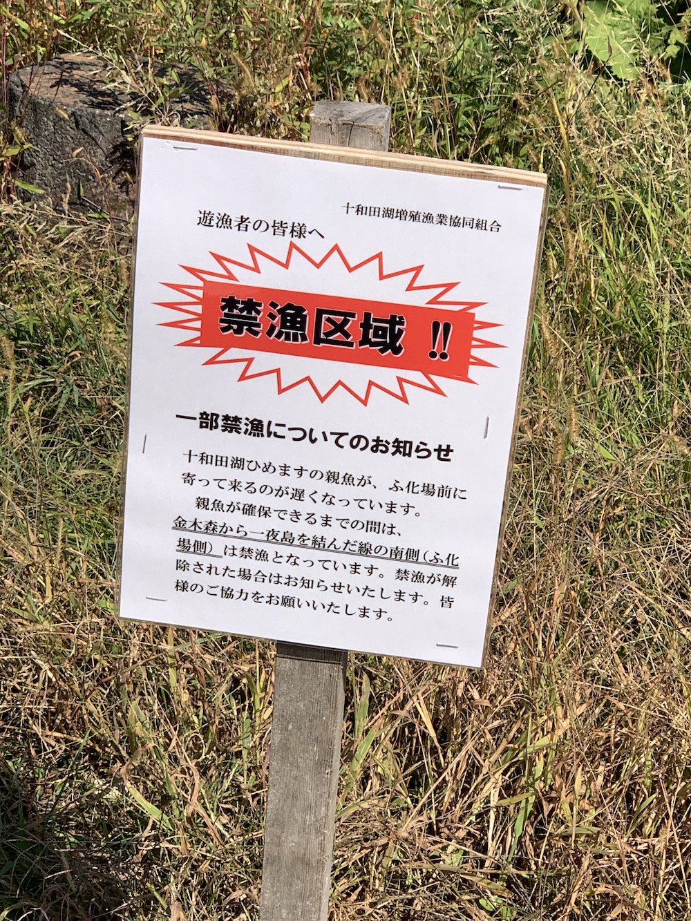 釣りのポイントには、こんな看板が…年々釣れなくなって来ている・産卵が遅くなっているとはなんとなく聞いていたけれど、大丈夫かな?